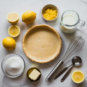 Heavy saucepan, balloon whisk, stand or hand mixer, rubber spatula, microplane, 9-inch pie shell, measuring cups and spoons, oven set to 350°F / 175°C.