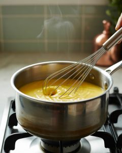Place the 3 egg yolks in a mixing bowl. Beat at high speed until thick and lemon-colored. This step adds structure and a fine texture. Slowly whisk about one quarter of the hot milk mixture into the yolks. Keep the mixer moving to avoid scrambling. Return the tempered yolk mixture to the saucepan with the remaining custard. Put the pan back over medium heat. Cook 2 to 3 minutes, stirring constantly, until silky and just bubbling. Remove from the heat.