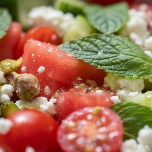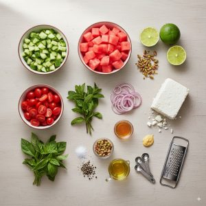This salad is my go to on hot days. I want crunch, juice, and chill in every bite. Start with crisp cucumber, sweet watermelon, and ripe cherry tomatoes.