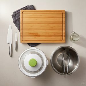 A sharp chef’s knife and a small paring knife handle all the cutting. Set a damp towel under a large cutting board so it does not slip. Dry herbs fast with a salad spinner or a clean tea towel.