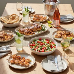 Pour drinks that stay crisp and clean. I like iced mint tea with a squeeze of lime. Sparkling water with grapefruit slices tastes bright and easy.